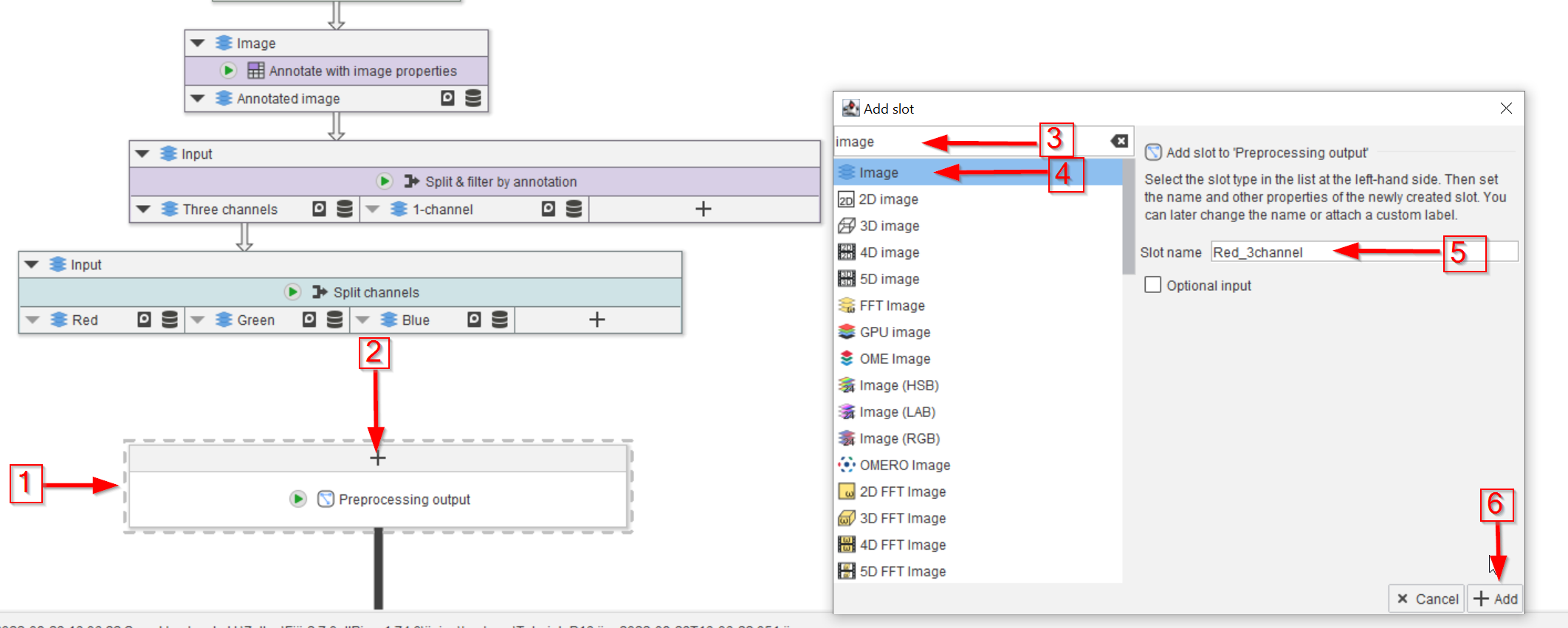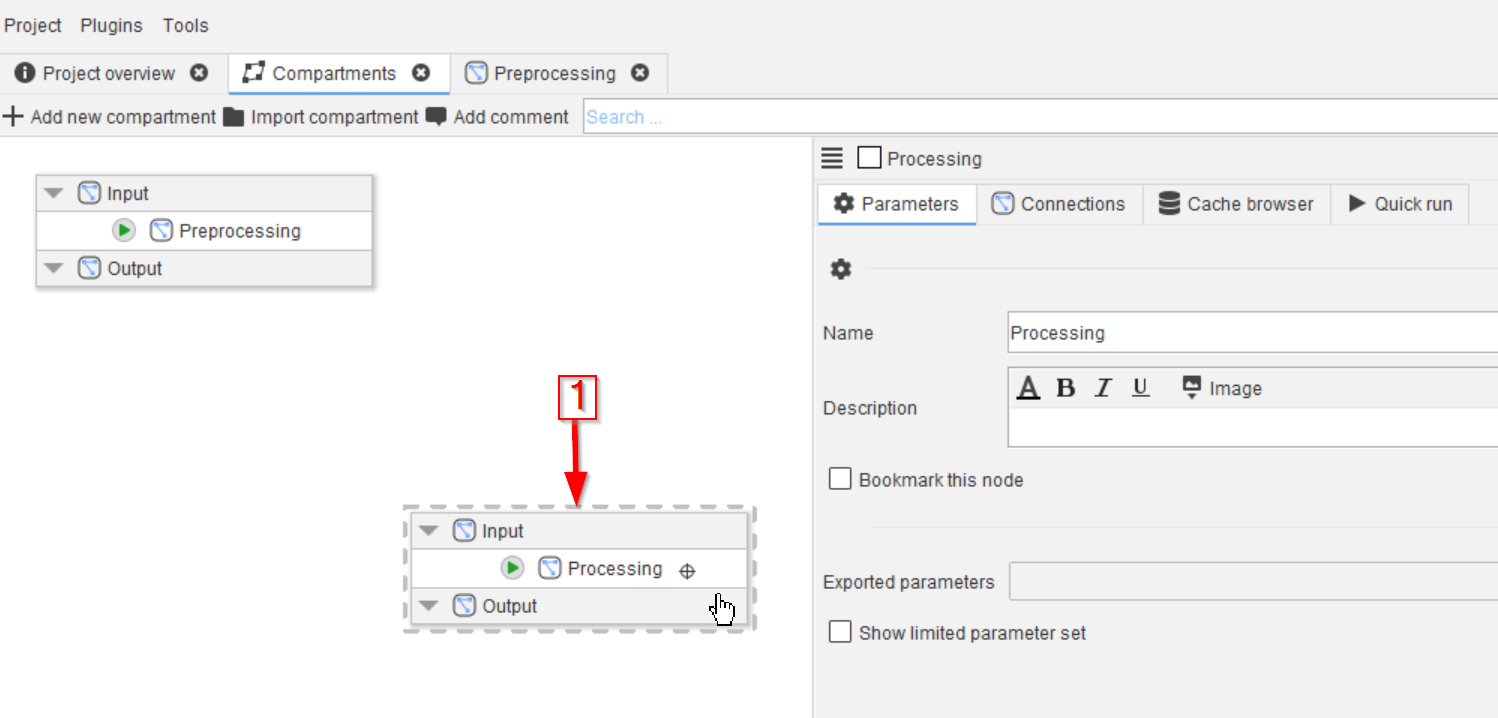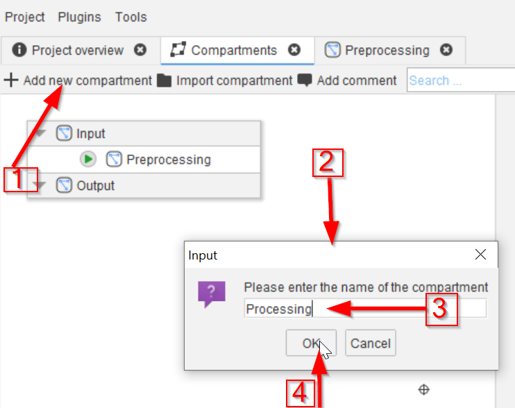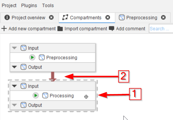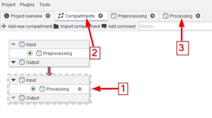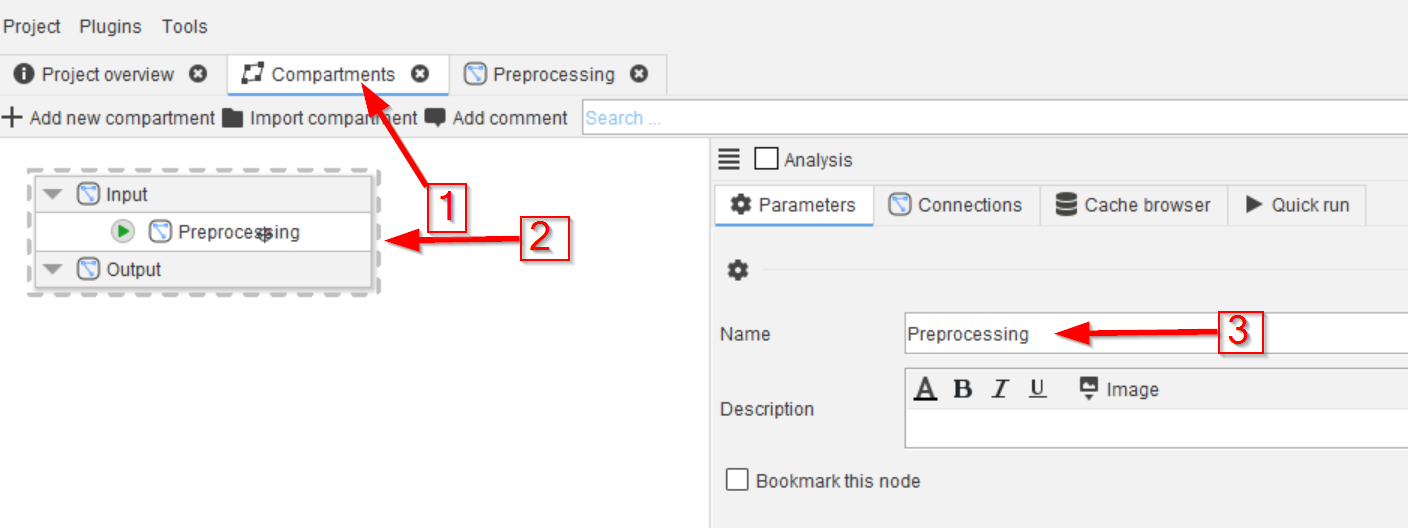 Begin by navigating to the Compartments tab (red arrow 1) and renaming the Analysis compartment (red arrow 2) to Preprocessing (red arrow 3).