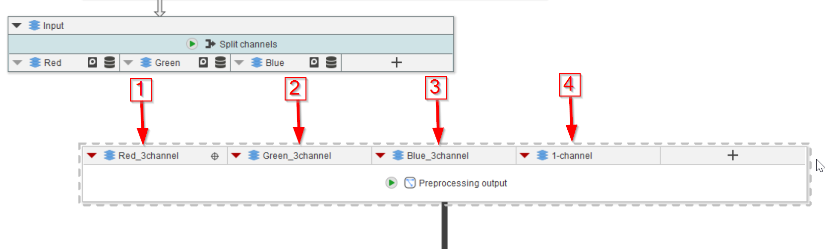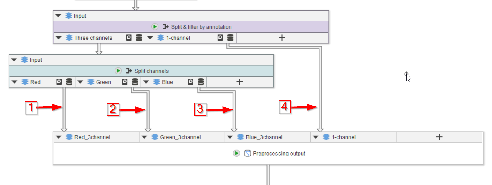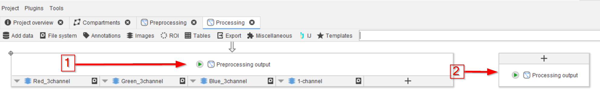 Before we start processing these images, we shall separate the processing nodes from the preprocessing nodes. The latter includes the steps that we have entered until now: folder structure, annotations, image import, image filtering based on annotations, and channel splitting (if necessary). It is easier to organize the pipeline if we now start a new work place as introduced earlier when we discussed compartments.