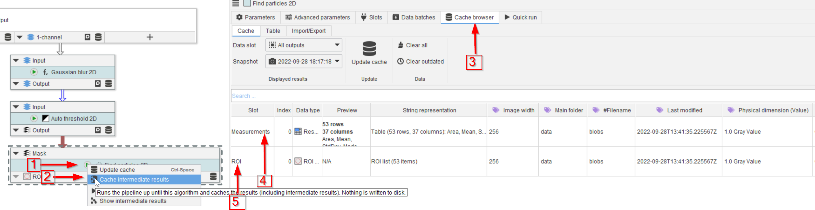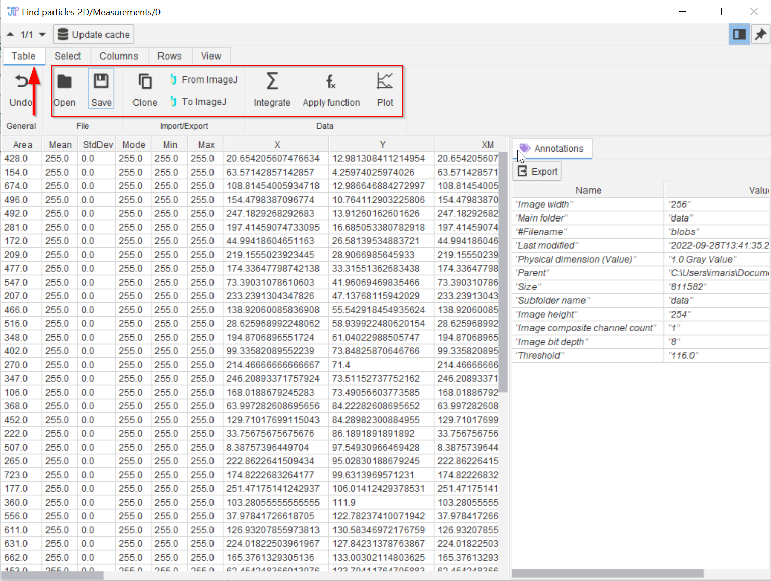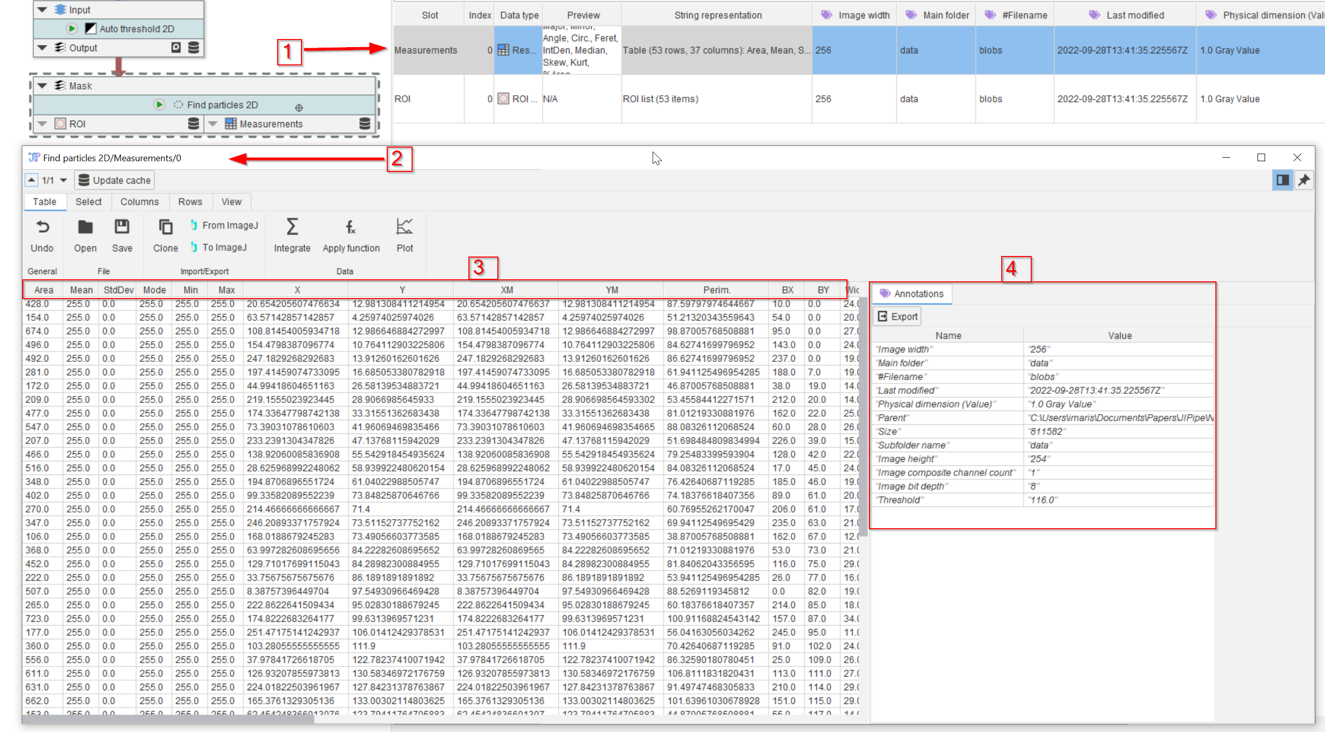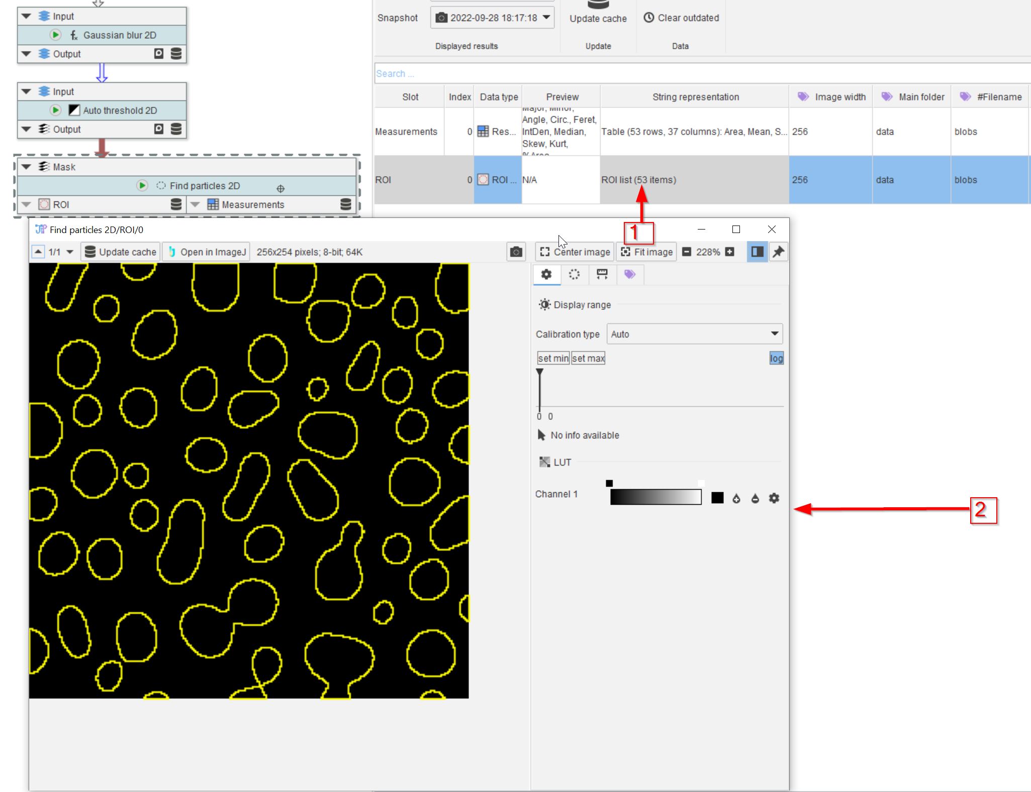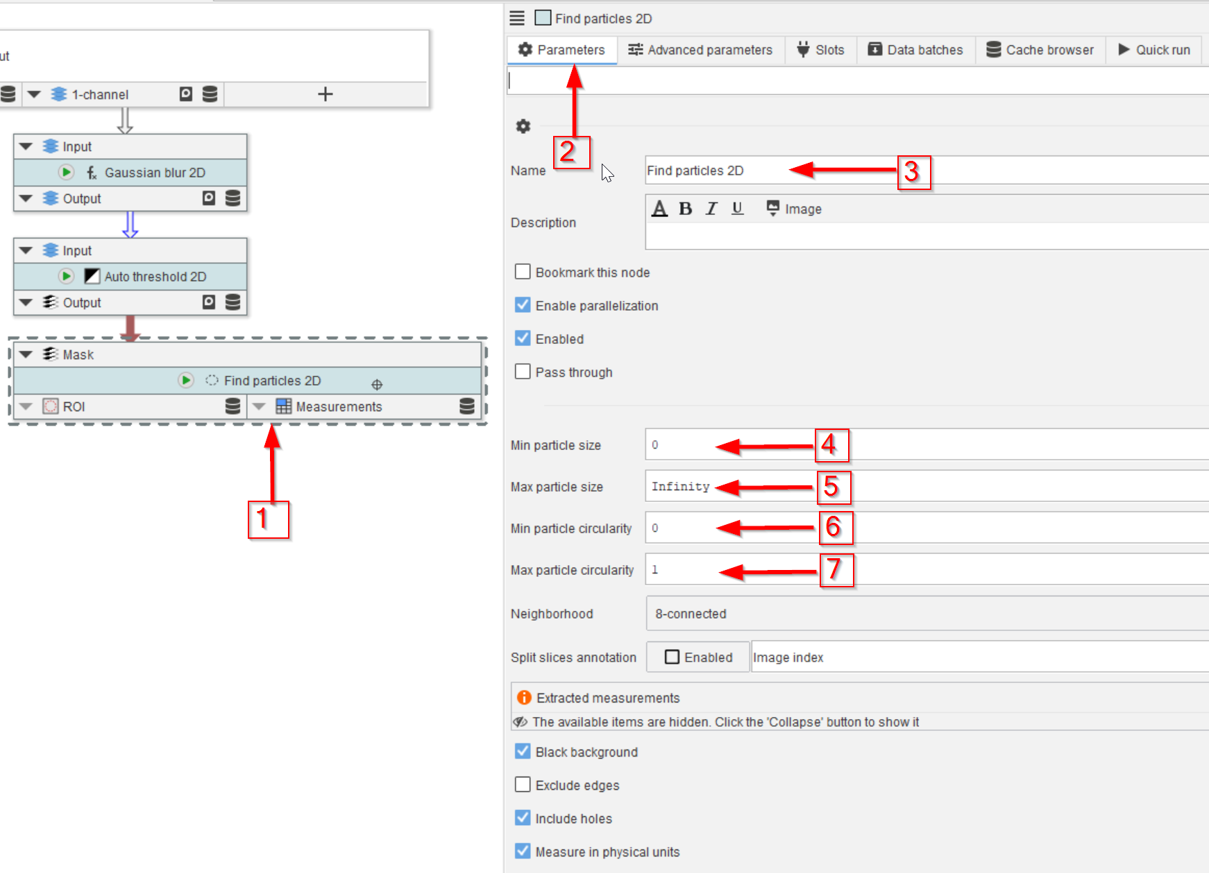 The Find particles 2D node is the JIPipe equivalent of the ImageJ command Analyze > Analyze Particles....