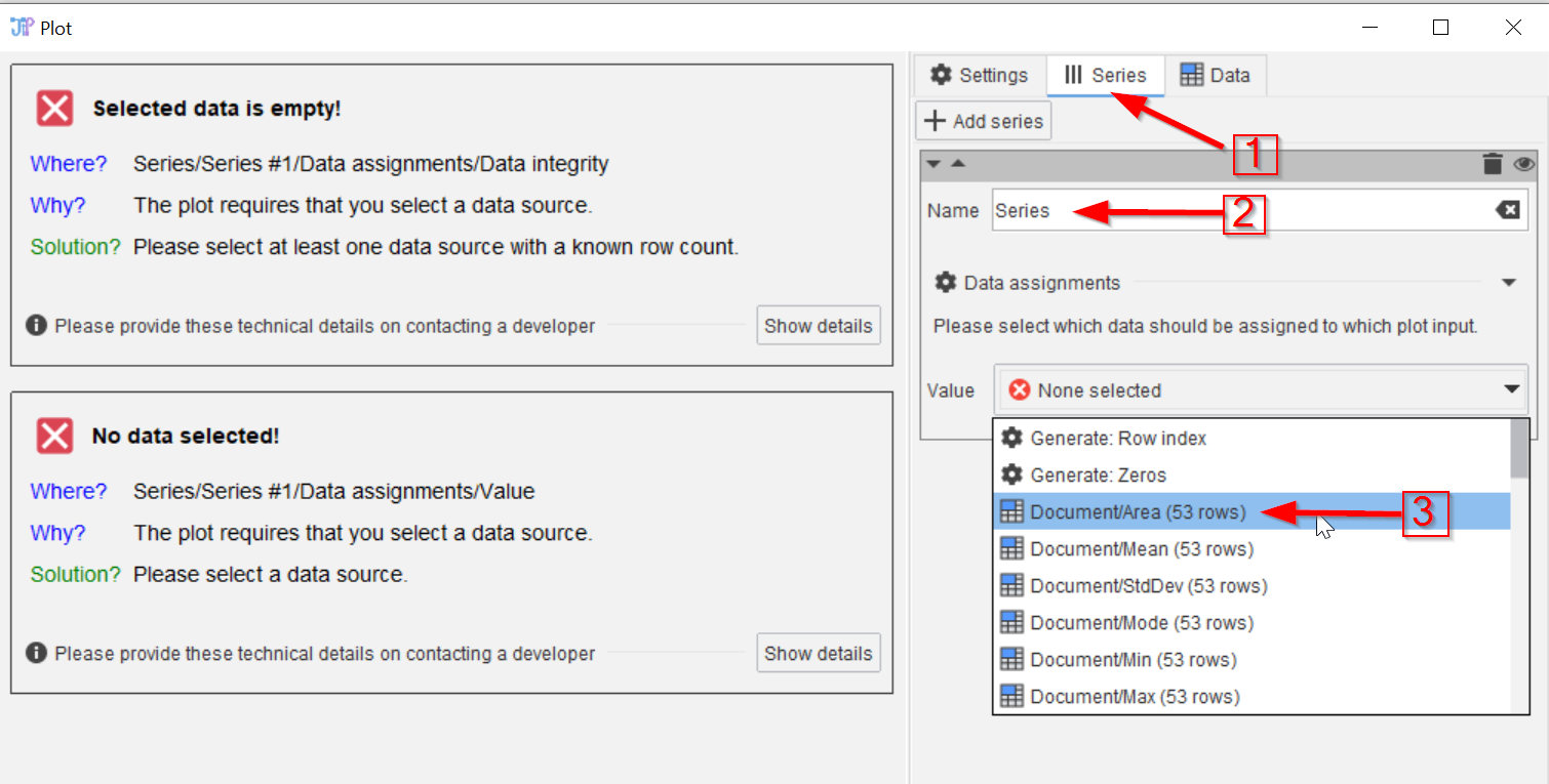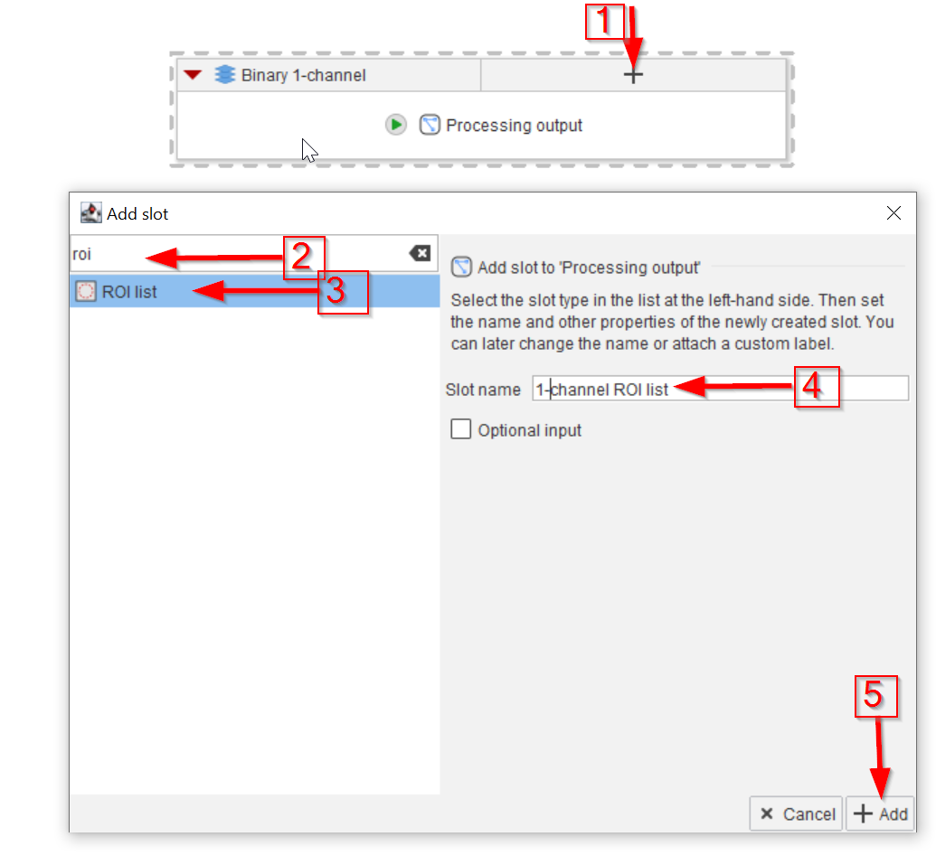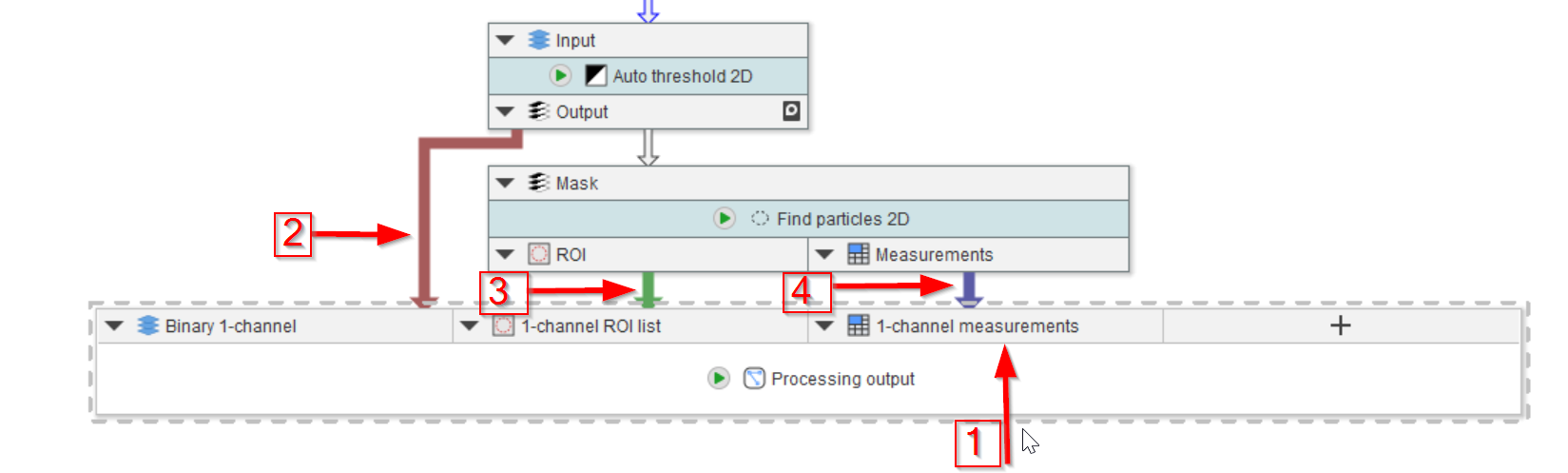 In the Processing compartment, disconnect the output node from the Auto threshold 2D node (red arrow 1).