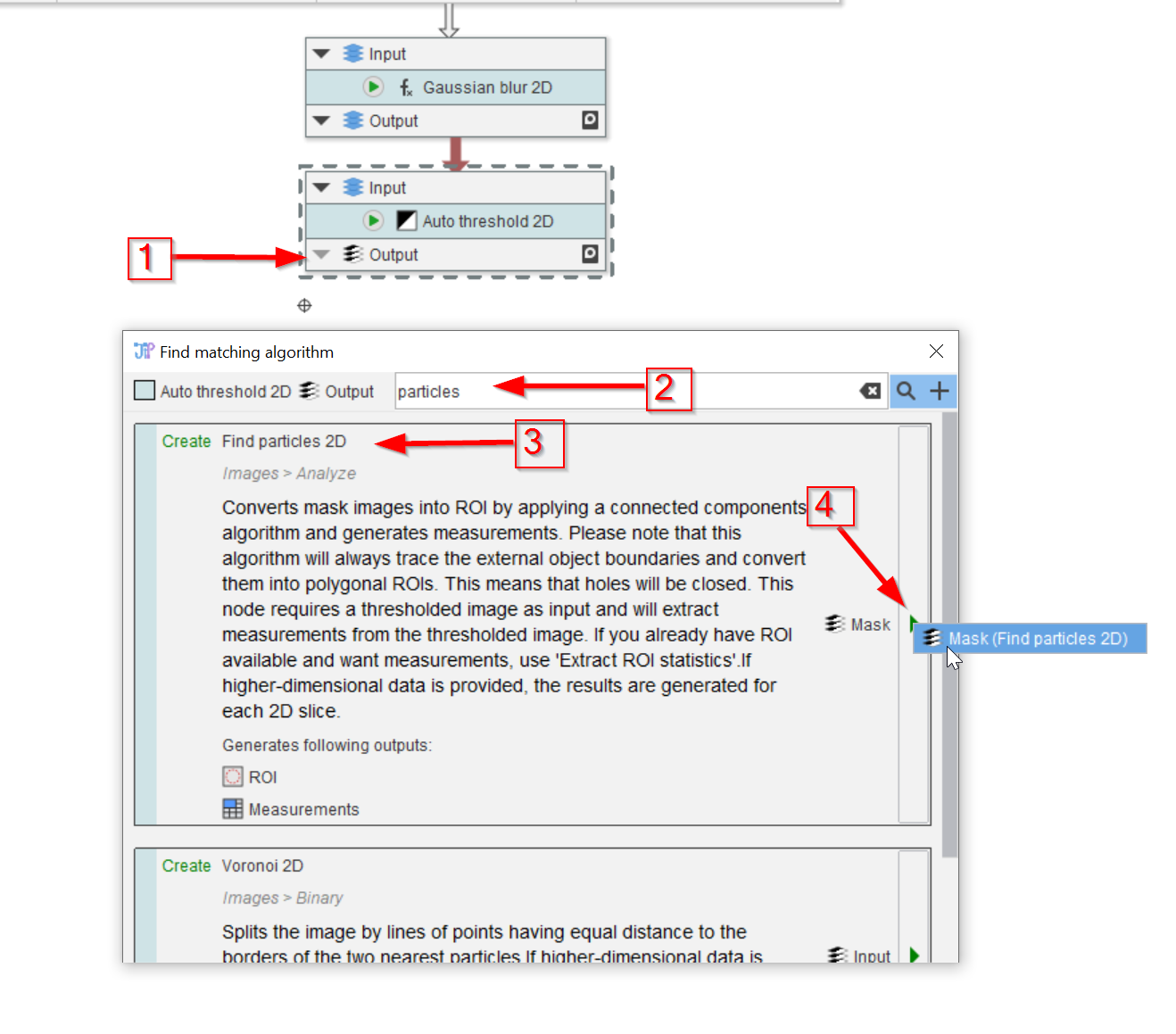 Locate the particle finder node by searching with keywords (red arrow 2, e.g., in the Find matching algorithm window. Chose the Find particles 2D node (red arrow 3) and add it to the pipeline (red arrow 4).