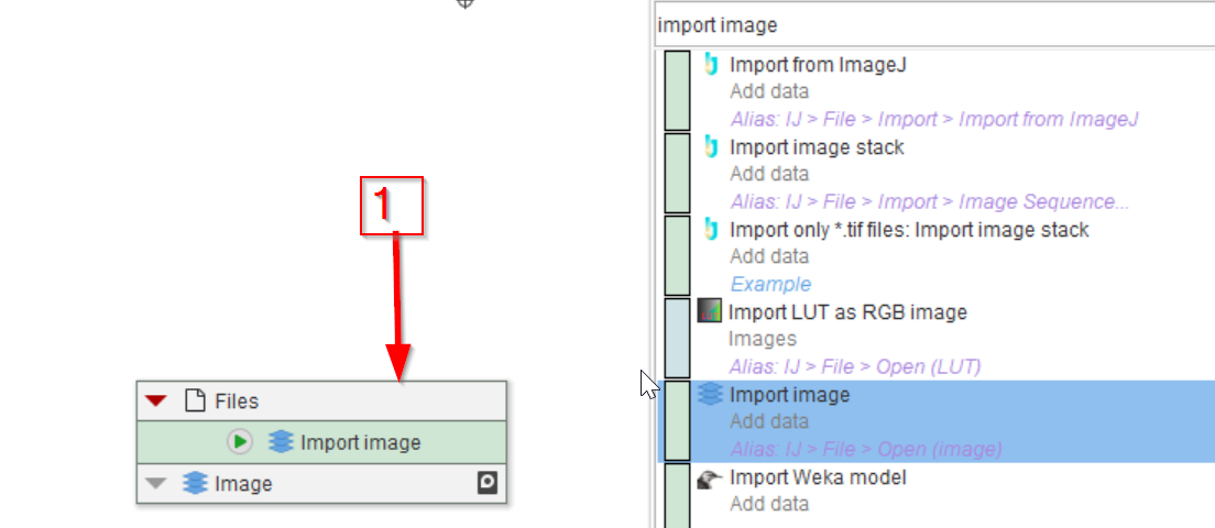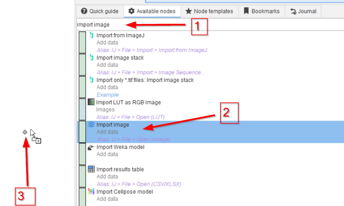 The search option works based on keywords, providing the closest matches. Using Import image (red arrow 1) will produce the proper node close to the top results (red arrow 2), from where the node can simply be dragged to the GUI with the mouse, left button down (red arrow 3).
