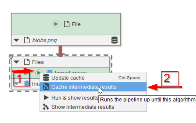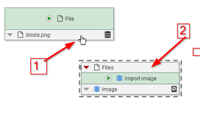To connect the Import node to the File node, simply draw a line with the mouse, left button pushed, to connect the bottom white zone of the File node (red arrow 1) to the top white zone of the Import image node (red arrow 2).