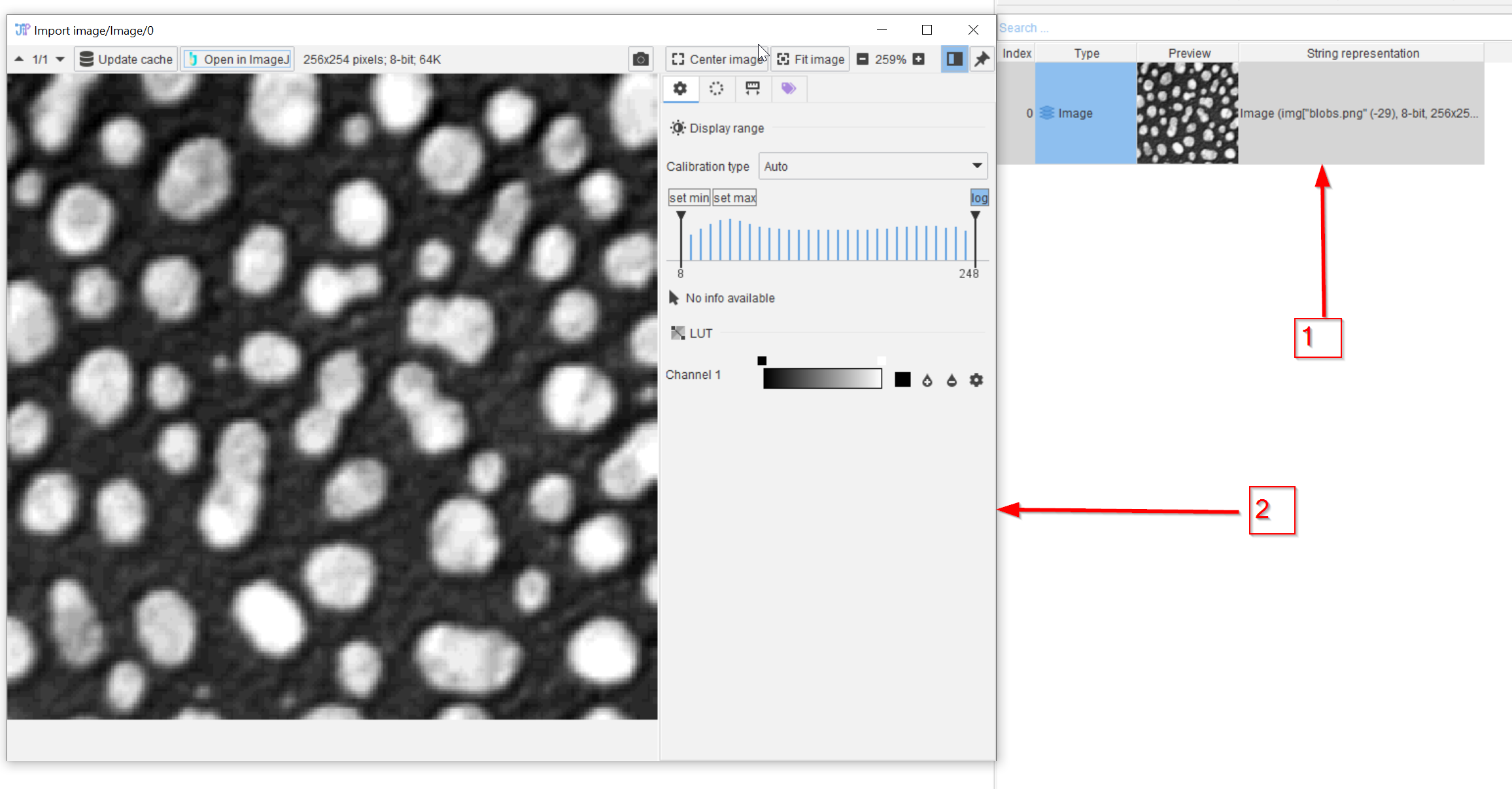 The Cache browser on the right (red arrow 1) will now show the image after having been read into the project