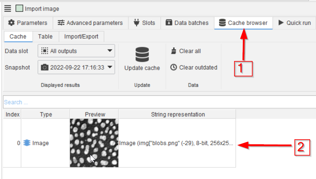 As described before, double-clicking on the cache element (red arrow 1) will open it in a viewer (red arrow 2)
