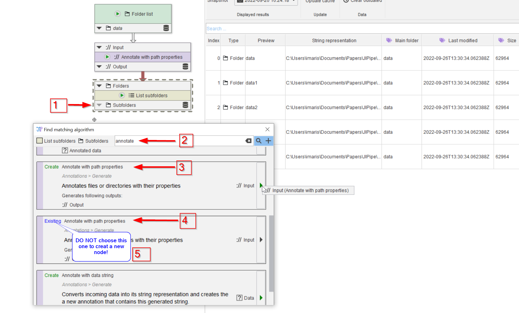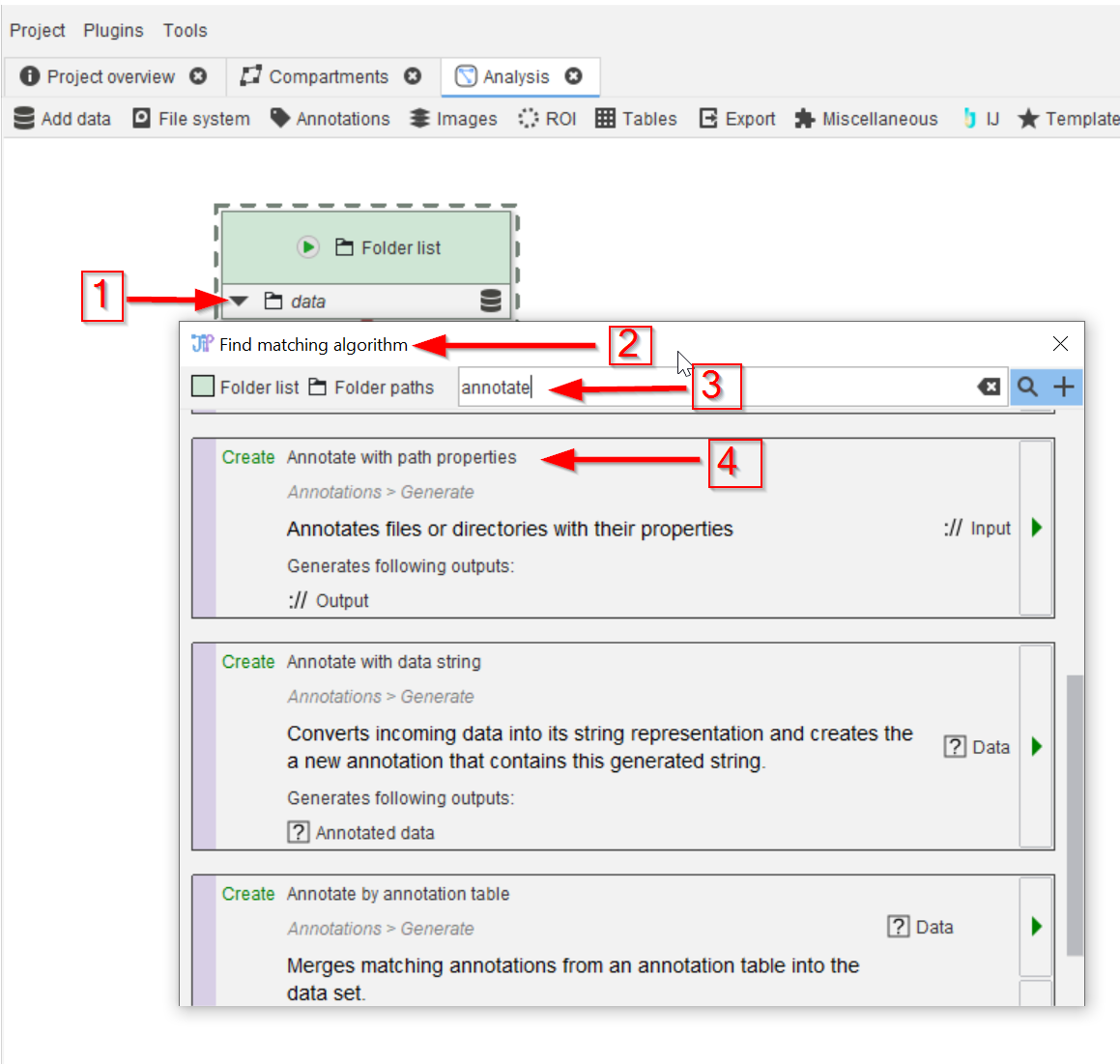Use the Find matching algorithm option (red arrows 1 and 2) to look for annotation nodes (red arrow 3) that are compatible with the folder node, and choose the Annotate with path properties node (red arrow 4)