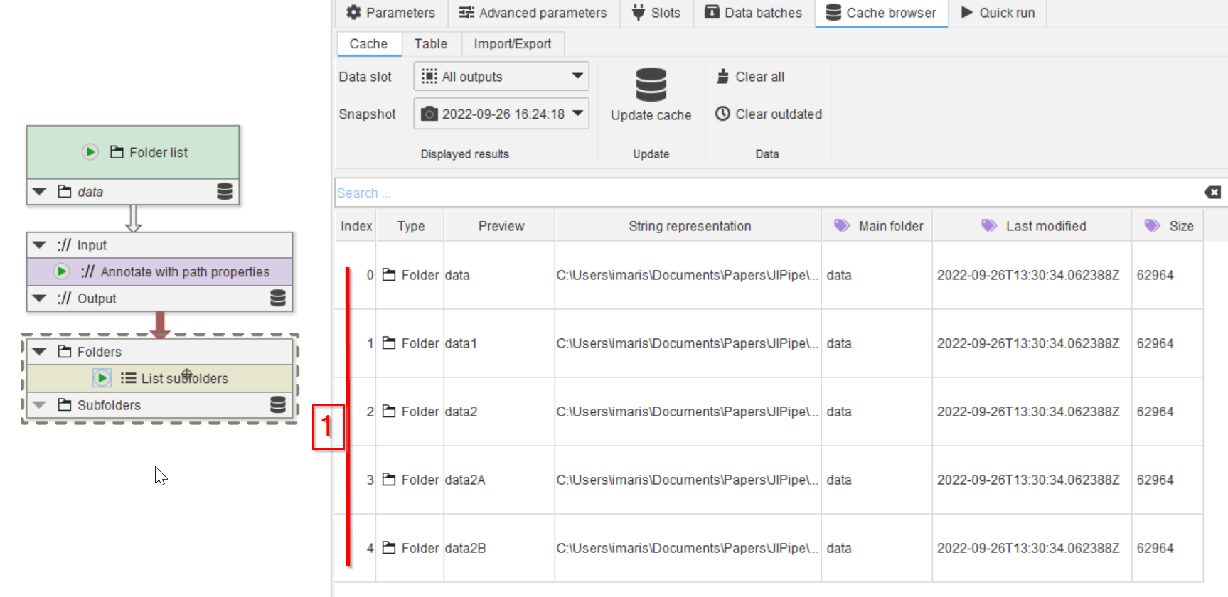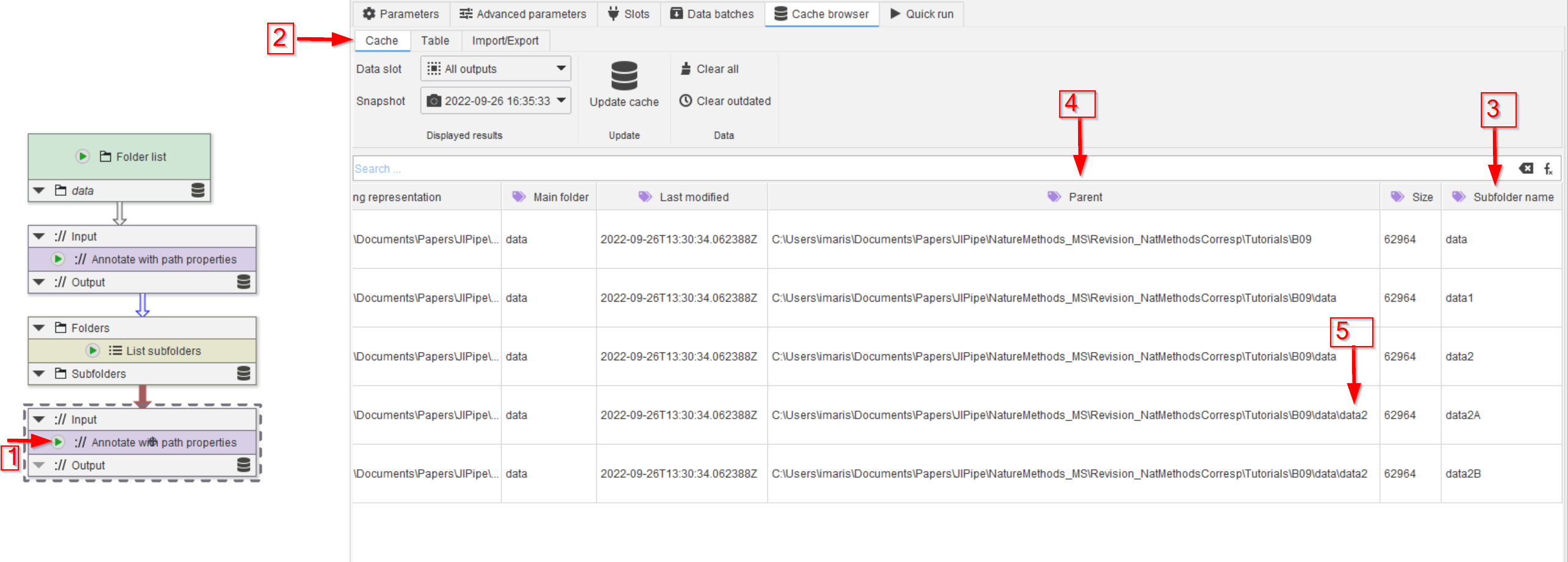 Run the new node (red arrow 1) and observe the cache (red arrow 2). Note that now the subfolder names are also remembered (red arrow 3), and that the parent name (red arrow 4) reflects the folder directly above the current subfolder (red arrow 5).