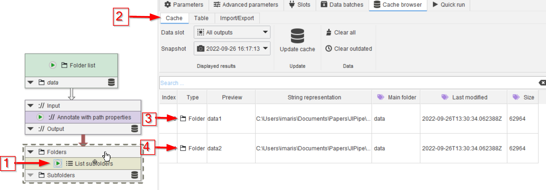 Run the new node (red arrow 1) and observe the cache (red arrow 2). Notice that the cache only indicates two subfolders (red arrows 3 and 4), whereas the data2 subfolder should have two of its own subfolders (check this in the downloaded data folder in the file system).