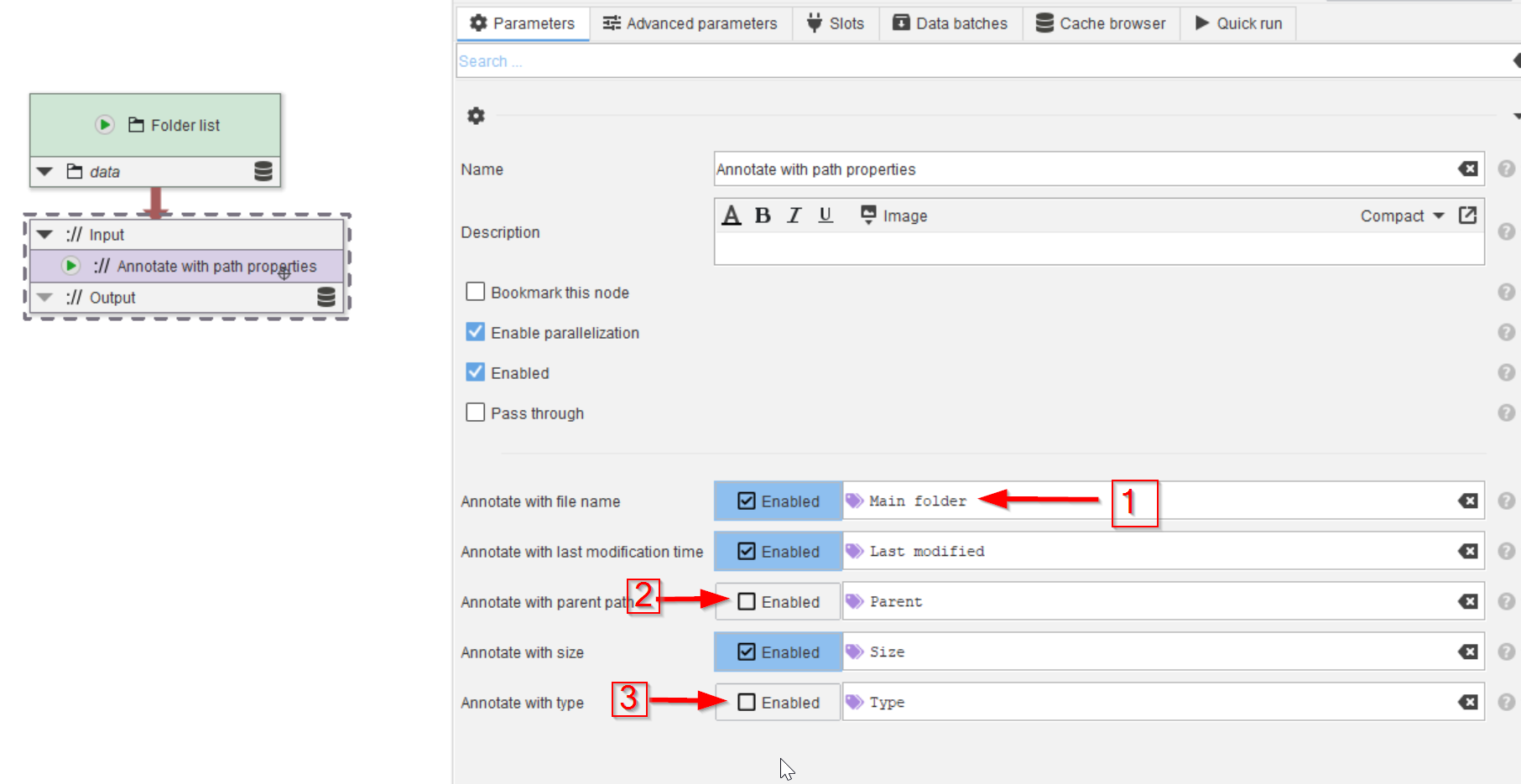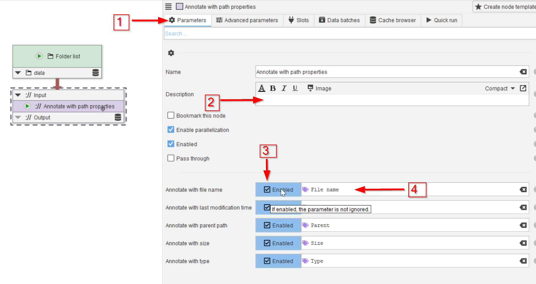 In the Parameters tab (red arrow 1) a description can be added to clarify the role of the node (red arrow 2), and the path properties that need to be added to the annotations can be chosen (red arrow 3). The checkboxes are all set by default. The parameter names are listed as they can be referred to later in the processing, when we rely on the annotations (red arrow 4).