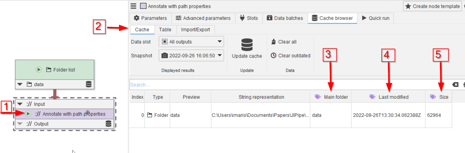 Run the annotation node with the Cache intermediate results option (red arrow 1) and observe the cache (red arrow 2). The newly added annotations now appear in purple-labelled columns (red arrows 3, 4, 5).
