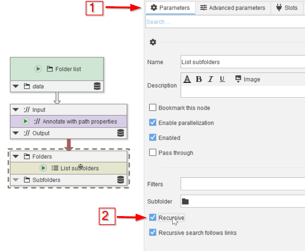 To fix this issue, go back to the Parameters tab (red arrow 1) of the node and activate the checkbox Recursive (red arrow 2).