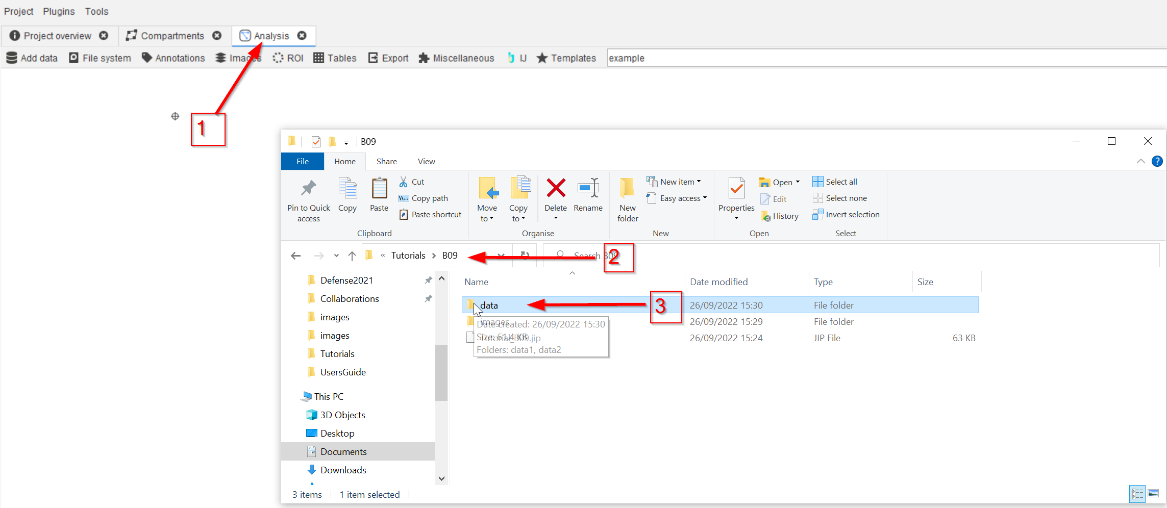 Create a new project file based on the one-compartment template and go to the Analysis compartment (red arrow 1). In the system file explorer, navigate to the tutorial folder after downloading it (red arrow 2) and find the data folder (red arrow 3).