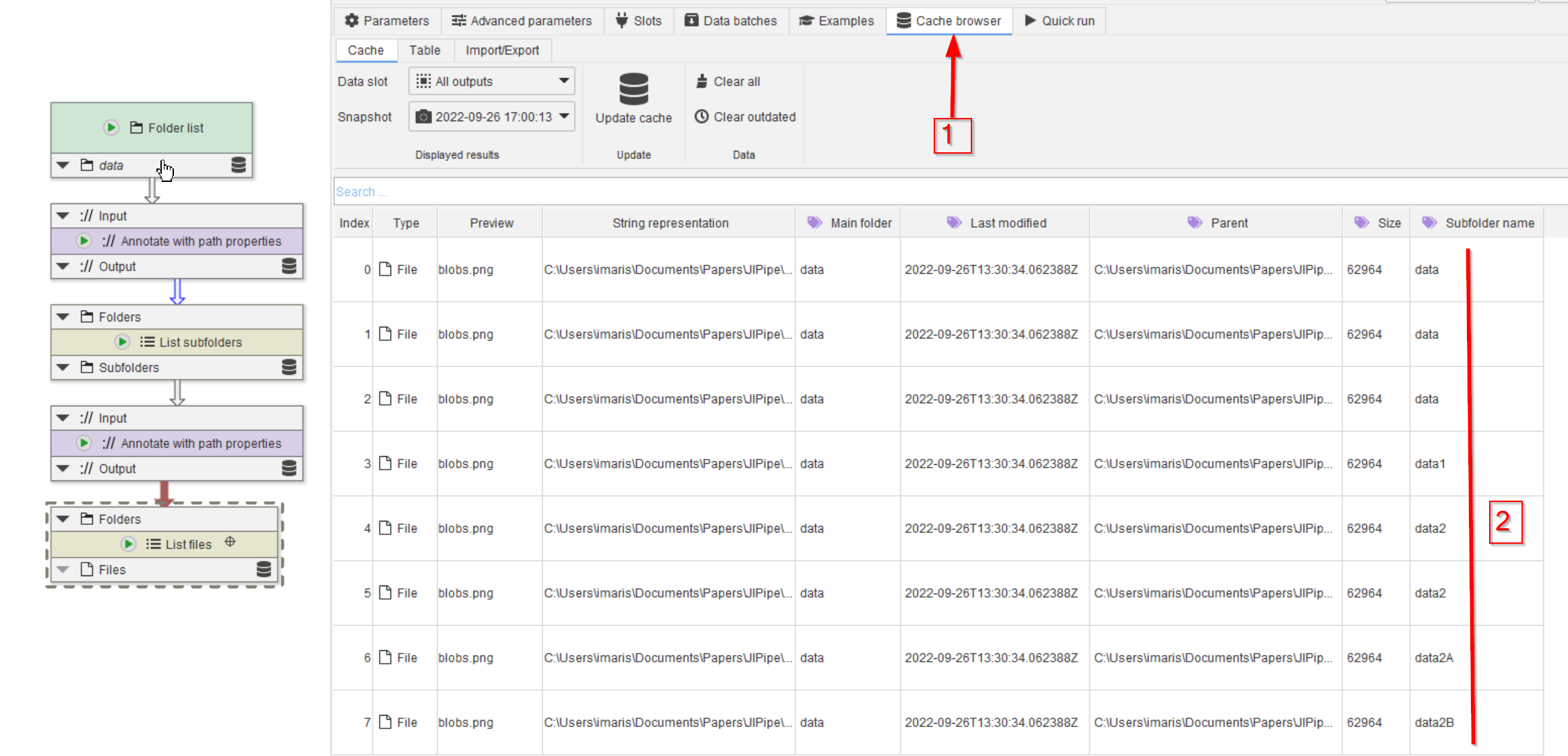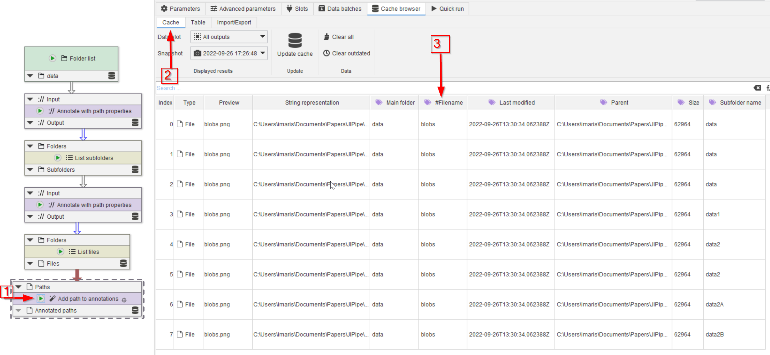 Run the node (red arrow 1) and check the Cache (red arrow 2). Now the #Filename annotation (red arrow 3) is part of the image database.
