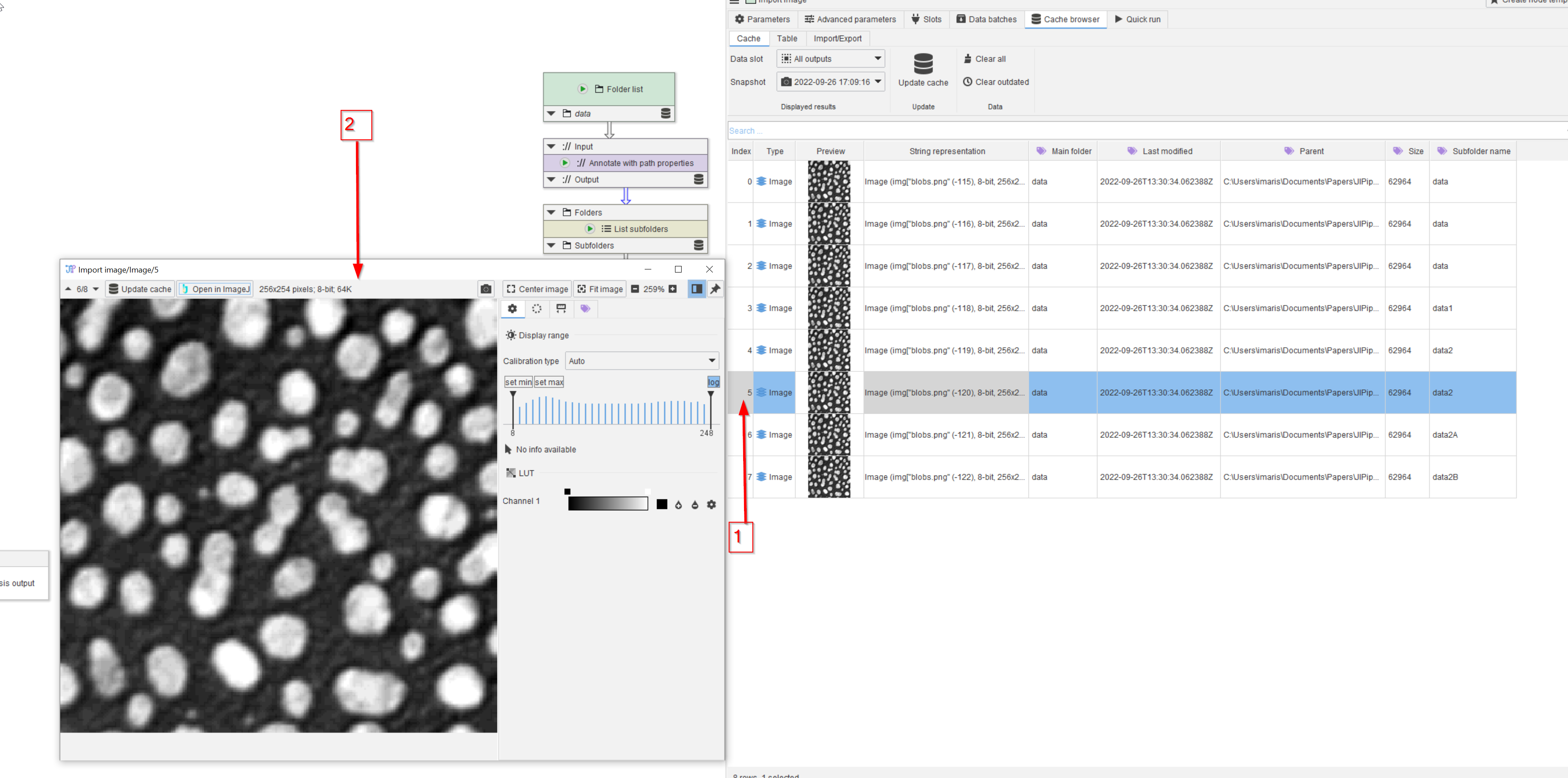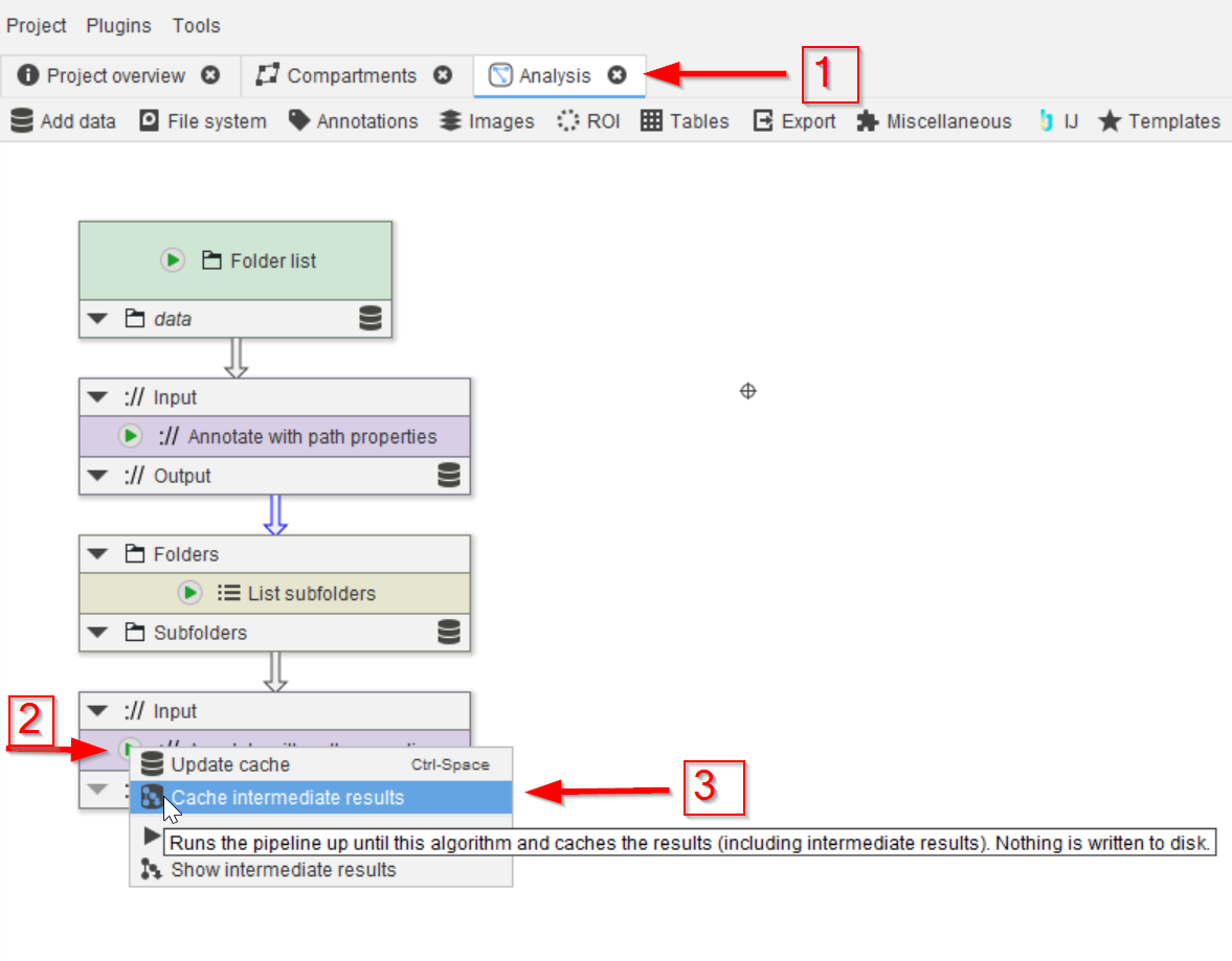 Open the project file from the tutorial Importing a directory of images I and navigate to the Analysis compartment (red arrow 1). Run the last node (red arrow 2) with the Cache intermediate results option (red arrow 3).