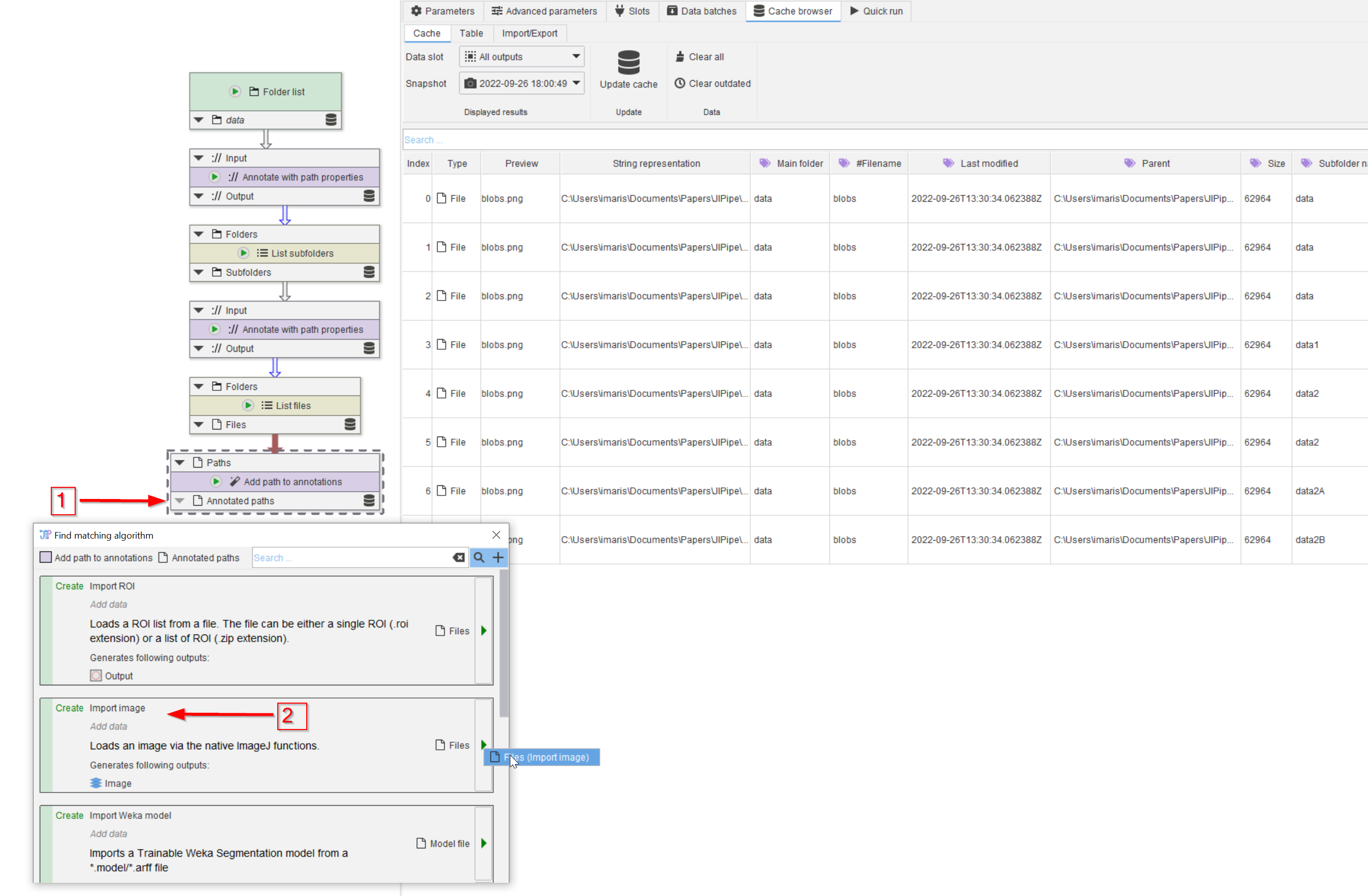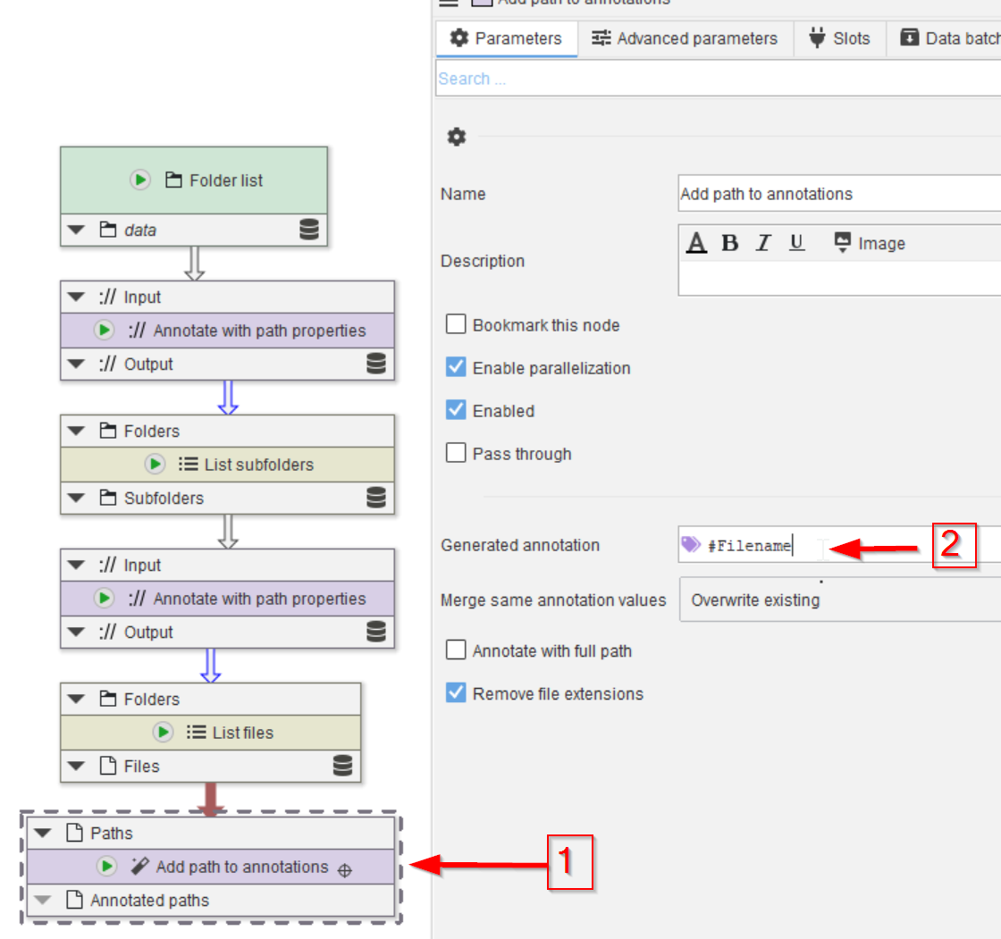 The file names also need to be annotated. Here we will use a simpler approach via the Add path to annotations node (red arrow 1); add this node via any of the ways we have seen before.
