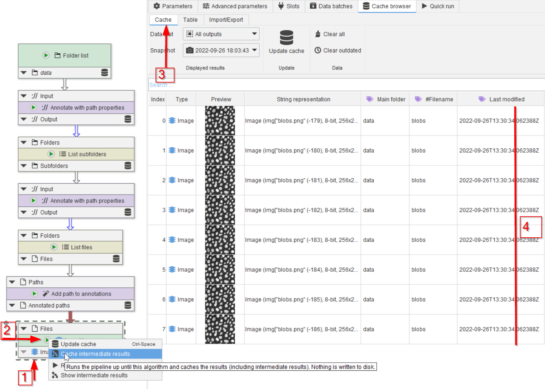 Add the node (red arrow 1) and run it (red arrow 2). In the cache (red arrow 3) we can now observe all the images (red line 4).