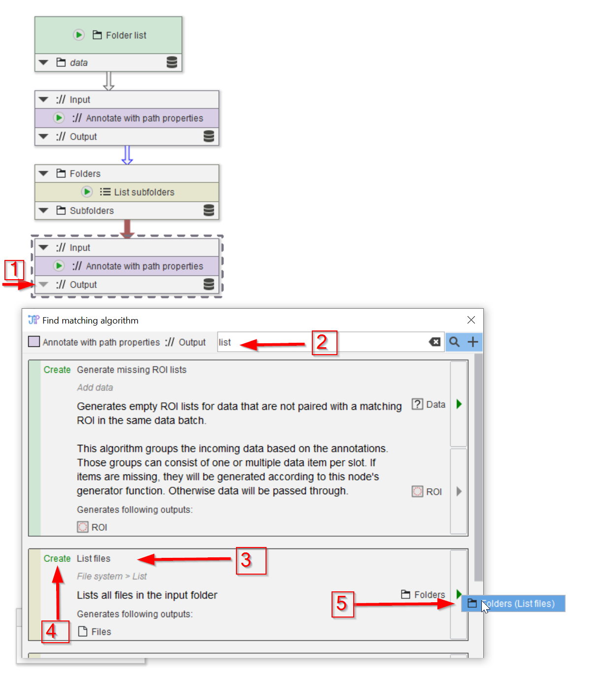 Now we need to get a list of the image files in all the (sub)folders. Use the node finder (red arrow 1) and check for list nodes (red arrow 2). Choose the List files node (red arrow 3), making sure that node will be created (red arrow 4). Add the new node (red arrow 5).