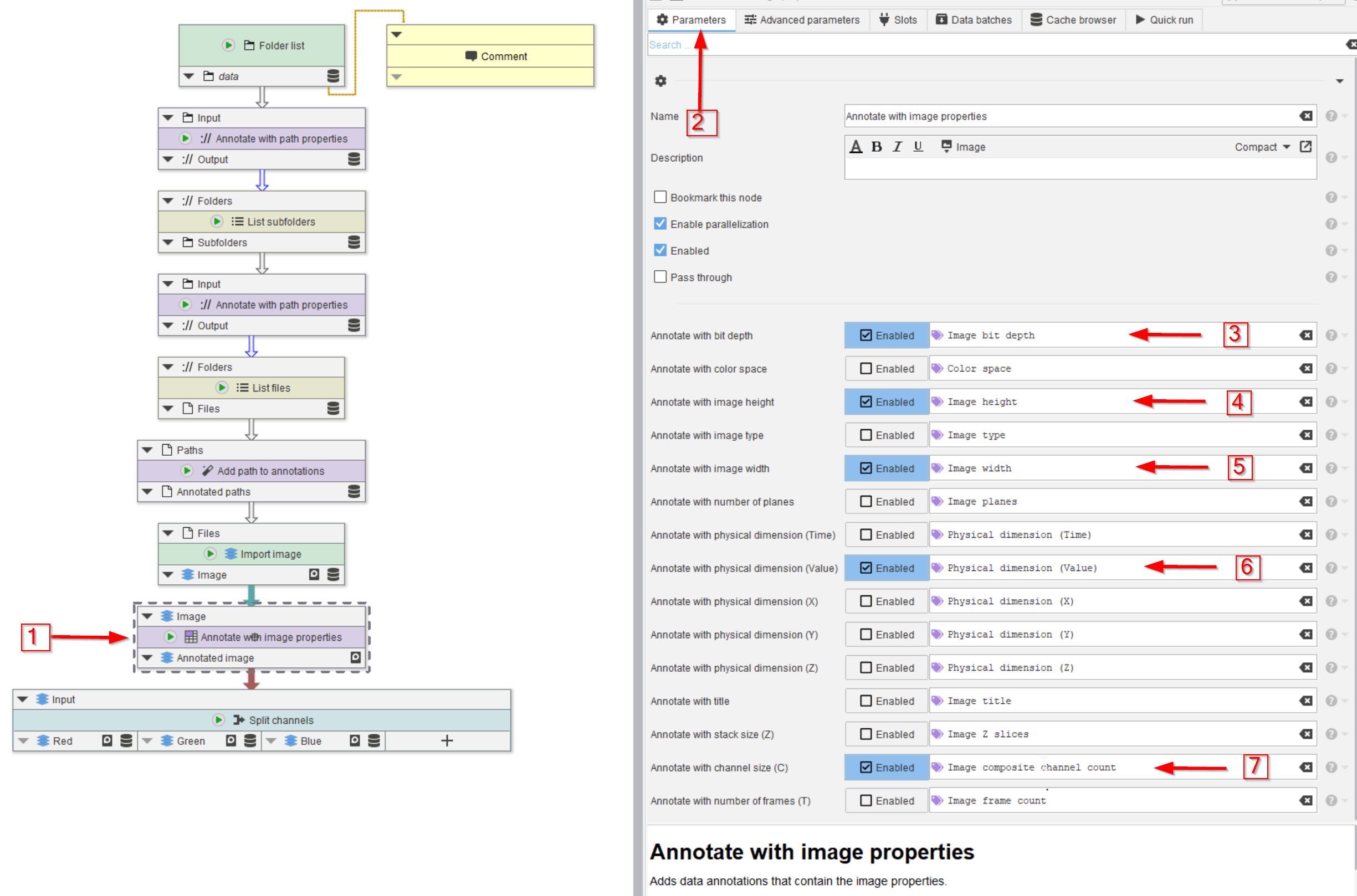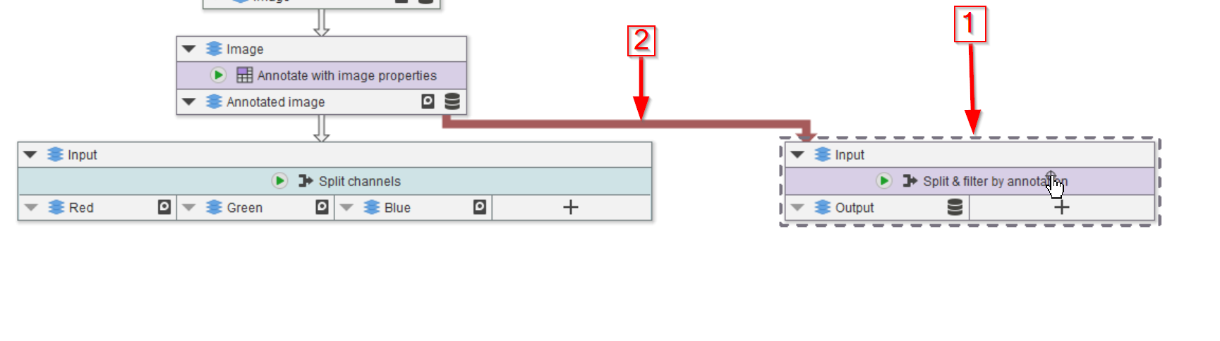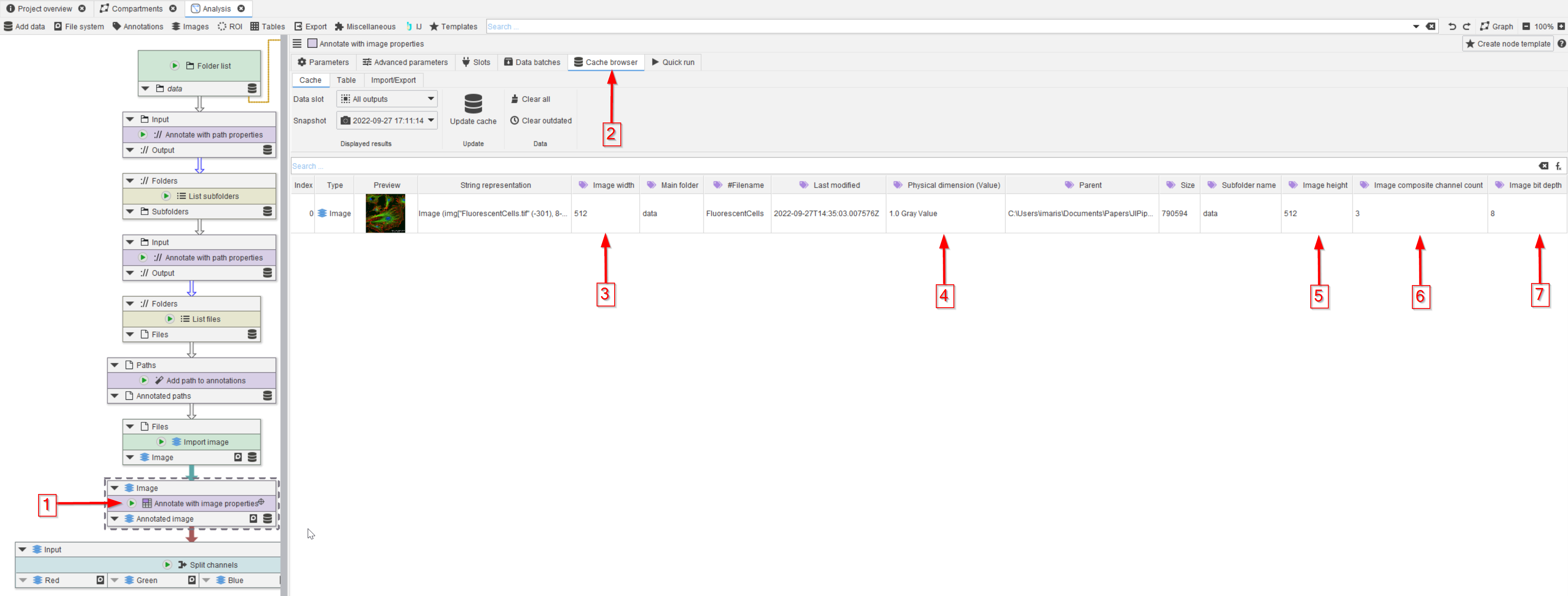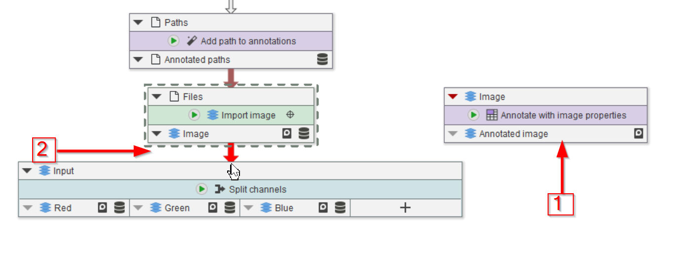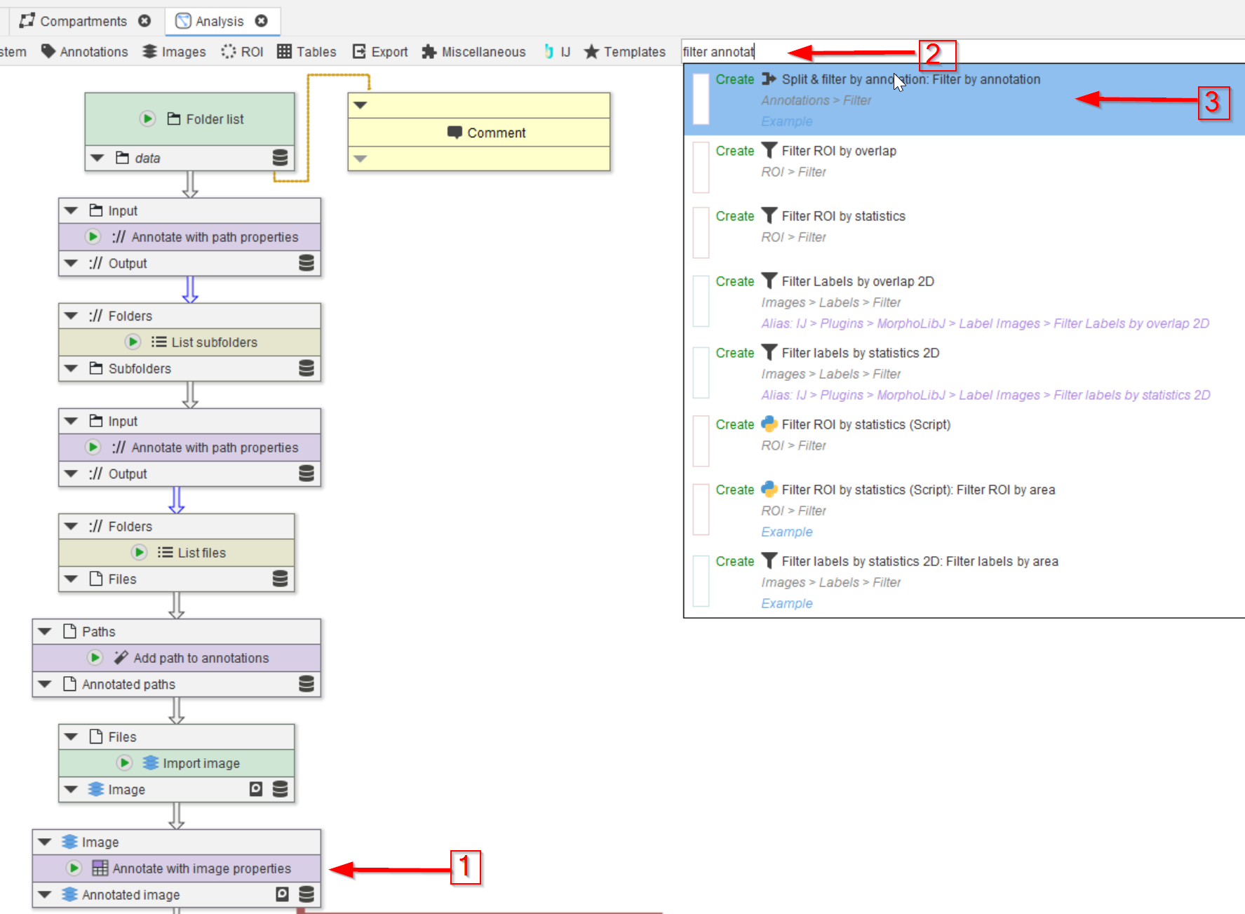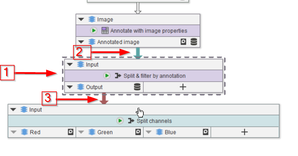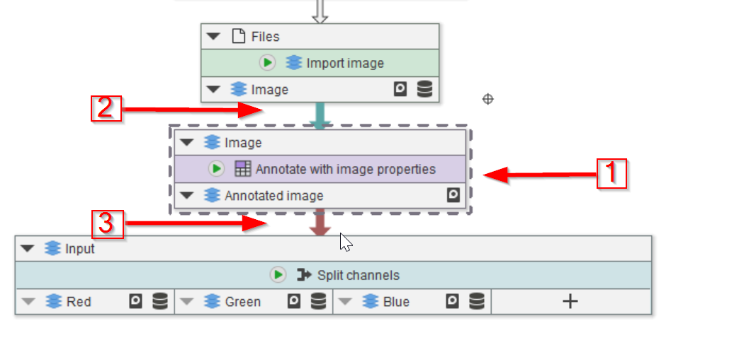 Select the Import image node (red arrow 1), we will use the image properties provided by this node to annotate the data. Use the Annotations tab (red arrow 2) to seek the necessary node in the Annotations > Generate menu (red arrow 3).