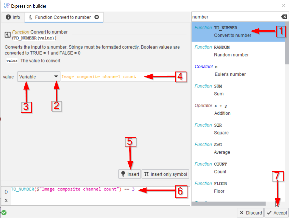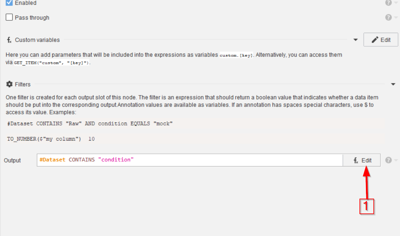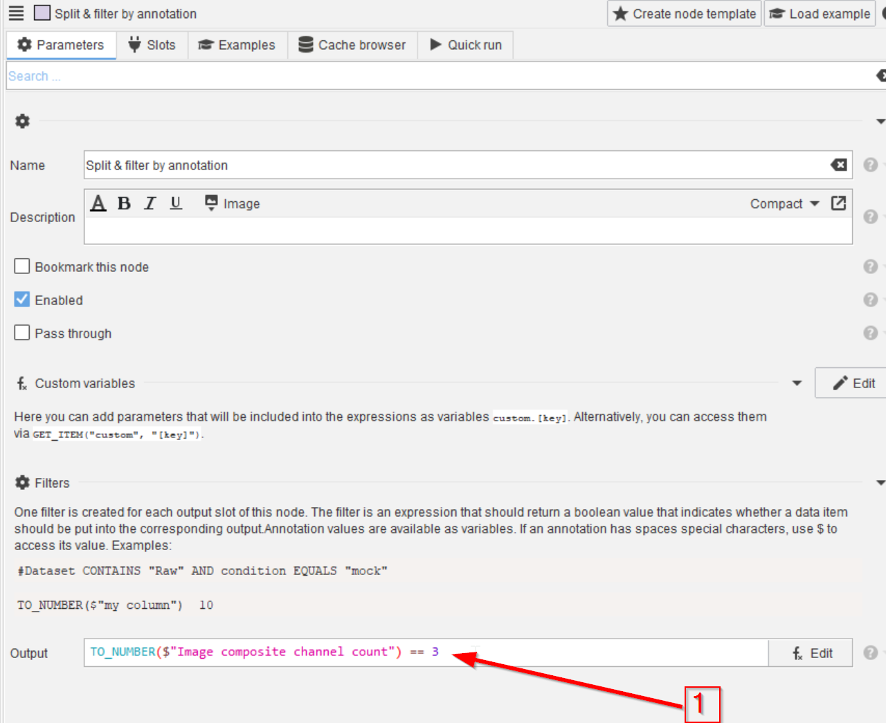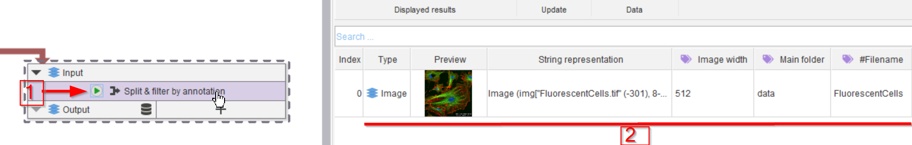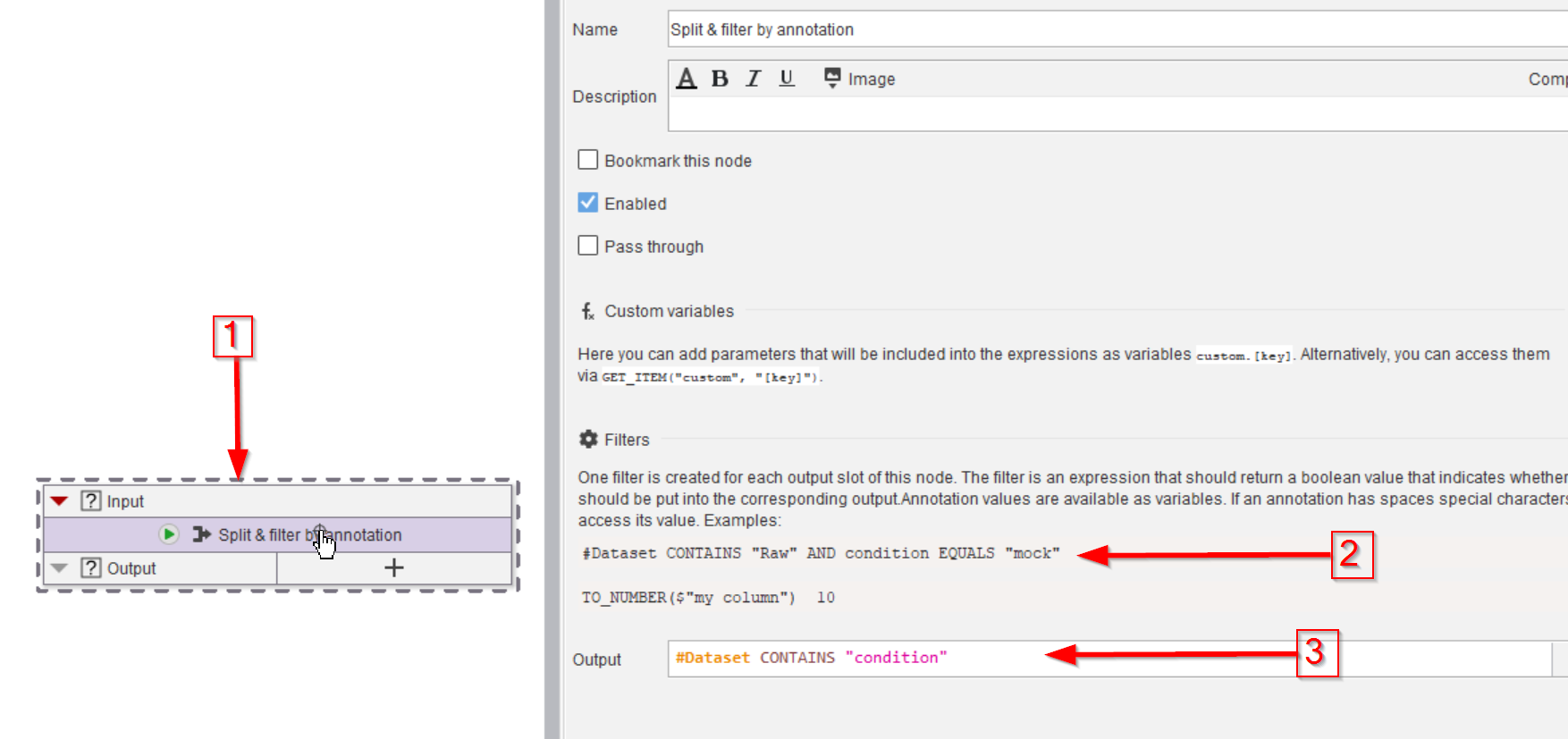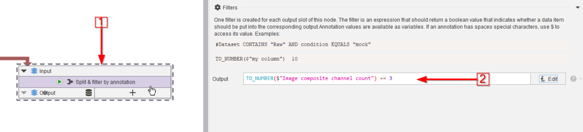 Select the Import image node (red arrow 1), we will use the image properties provided by this node to annotate the data. Use the Annotations tab (red arrow 2) to seek the necessary node in the Annotations > Generate menu (red arrow 3).