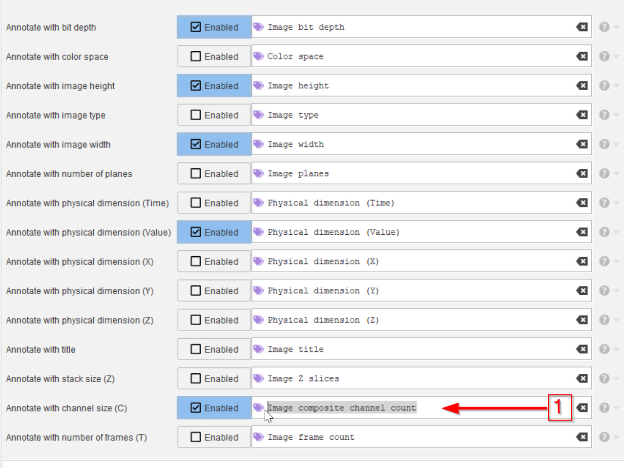 The node Annotate with image properties can create JIPipe-managed annotations from properties (width, height, physical sizes, …) of an image. As annotations are preserved during all processing steps, this allows to apply a multitude of powerful operations in later steps.